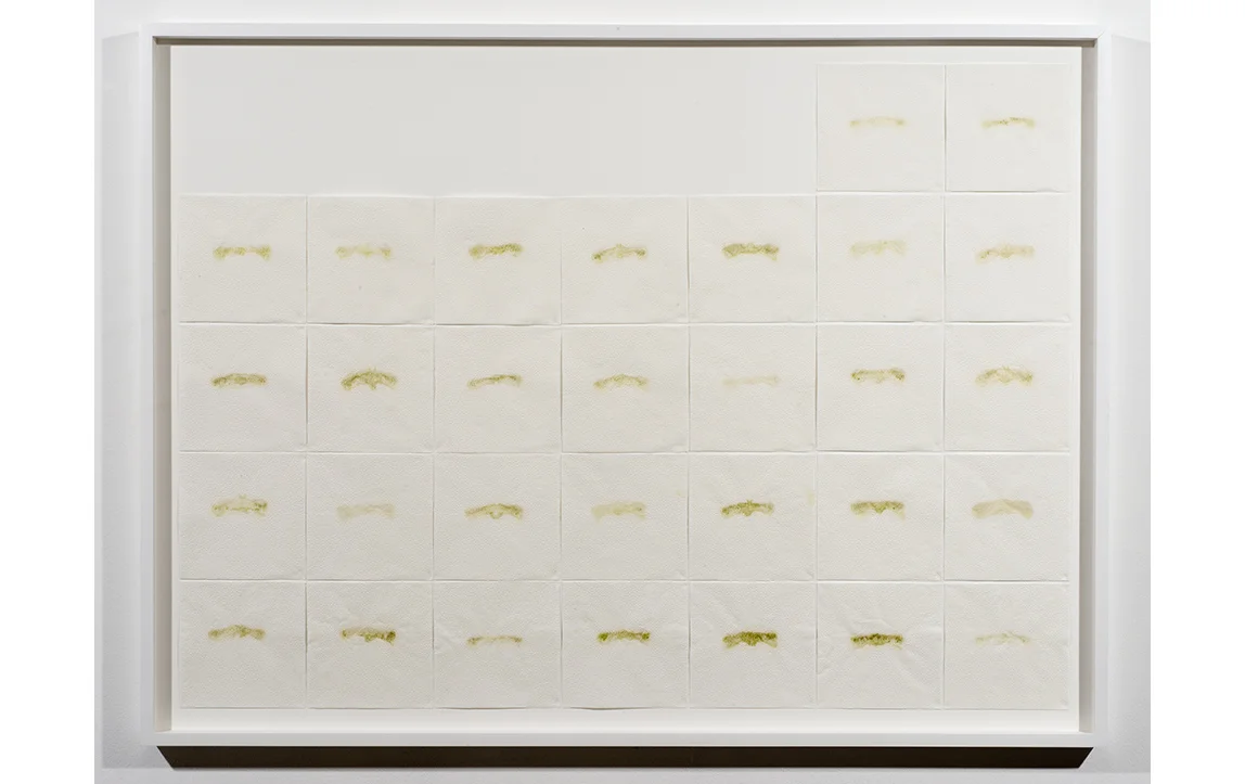 April, 2013, Cucumber, celery, fennel, rainbow chard, kale, collard greens, beet greens, dandelion greens, turnip greens, spinach, parsley, wheat grass, ginger, lemon juice, water, and Greener Grasses powder on thirty paper 6 x 6 in paper napkins, 34 x 45.5 x 2 in / 86.36 x 115.57 x 2cm
